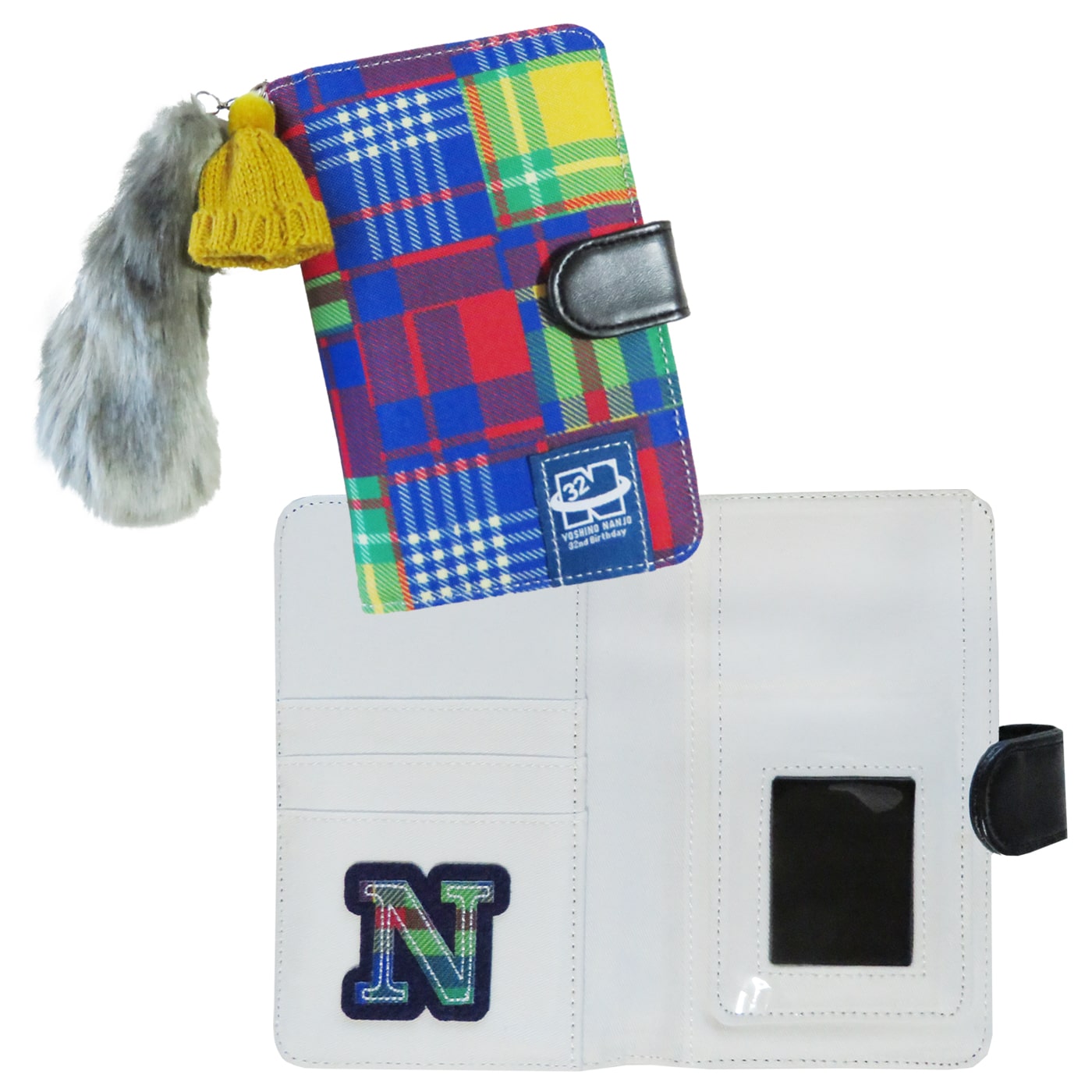 パッチワーク柄の本体に、イエローのニット帽とグレーのファーをあしらったチャームをセットした手帳型スマホケースです。スマホを粘着シートで固定する仕様で、ほとんどすべてのスマホに対応します。