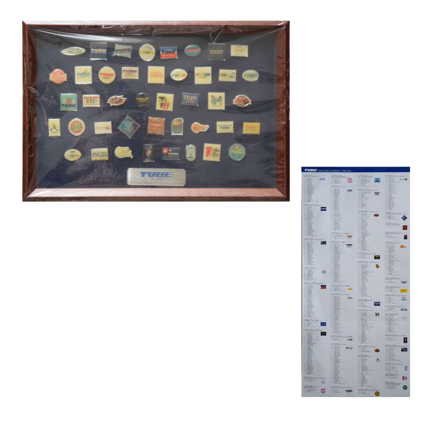 歴代ツアーロゴピンバッジ額装。ツアースケジュールが記載のブックレット付き。