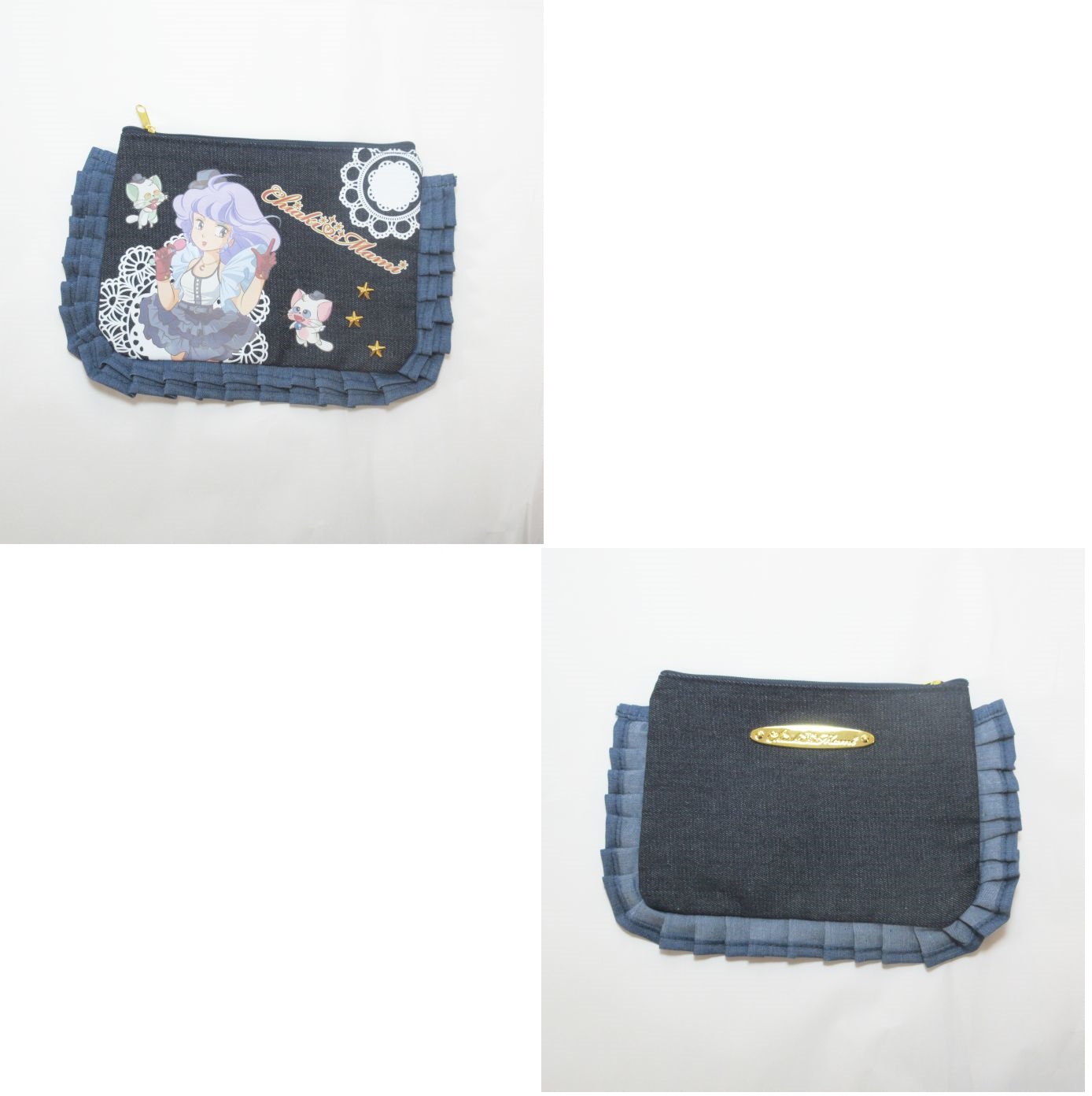 「魔法の天使 クリィミーマミ」とのコラボ商品です。コラボデザインに合わせてデニム生地というこだわり。デニムのフリルをつけて、コラボデザインの衣装ともぴったりです。ゴールドのプレートには「chiaki&mami」という今回のコラボを記念した文字が入ってます。ペンケースとしても使用できますし、ミラーもちょうど入る大きさです。