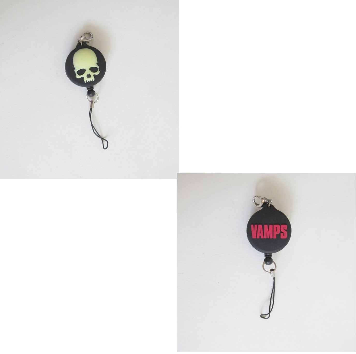 引っ張ると伸びる髑髏のロゴをあしらった携帯ストラップです。