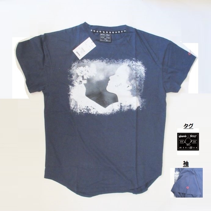 glamb に出会ったときのイメージがこれなんです。外人のかわいい女の子か赤ちゃん。そのイメー ジが、僕にとってglamb のTシャツのイメージ。そこに僕のシンボルでもあるマークをフェイク で「Nixxy」と入れさせていただきました。2006年、ストリートで隆盛を極めていたレディTを今の気分でお届けするこちら。Nissyを想像し花束に口づけをする彼女のチャーミングな横顔も、そのほっぺにはNixxyの文字が。間違ってペイントしてしまったその様に更に可愛さが積もります。モノクロの被写体とネイビーのボディカラーのノーブルなコントラストになっております。