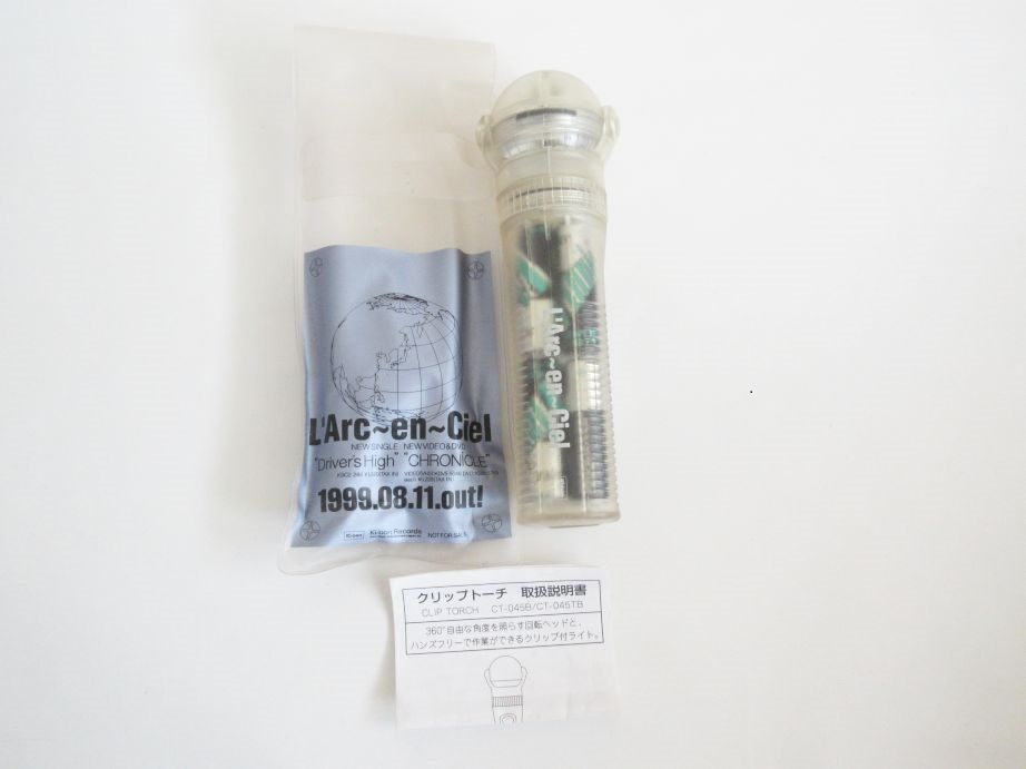 1999年8月発売の"driver's high ""CHRONICLE"ノベルティのクリップトーチ。360℃自由な角度を照らす回転ヘッドとハンズフリーで作業ができるクリップ付きライト。電池式。動作未確認。