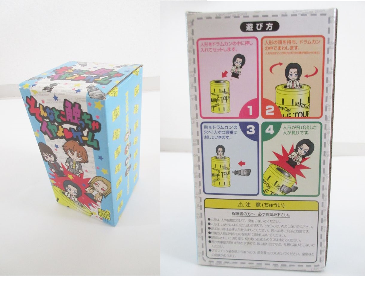 樽に指を入れる場所がたくさんあり、どこかが当たりになっており、そこに指を入れると人形が飛び出てしまいます。黒ひげ危機一髪のようなゲームです。メンバーフィギュア4対付属しております。それぞれのメンバーでゲームをお楽しみいただけます。
