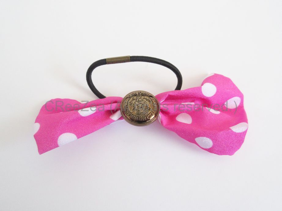 ドット模様の大きめのリボンヘアゴム。リボンの中央部分はAAAのコインのデザイン。
